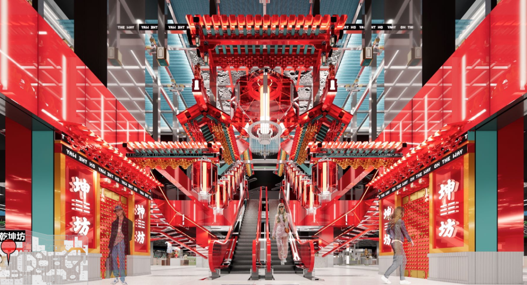 作为国内首个新国潮MALL,地上7层、地下2层的王府井喜悦体量为7.8万㎡,从国风元素的硬件设施,层叠变异的的视觉效果,再到Y3K沉浸式新国潮美学空间的未来场景营造,项目着力塑造以中国数字科技、中国新锐艺术和中国品牌为核心的新国潮。