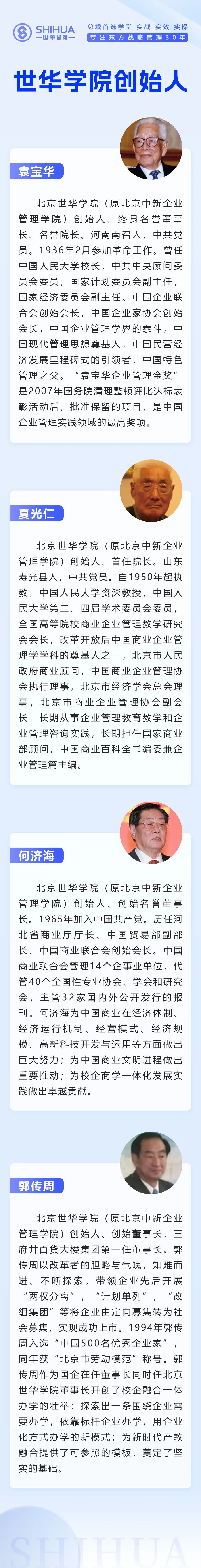 1993年中国特色管理之父袁宝华先生与中国商业企业管理学科奠基人夏光仁先生,时任中国贸易部副部长、中国商业联合会首任会长何济海先生,北京王府井百货大楼(集团)董事长郭传周先生联合中粮集团、北京友谊集团、中棉集团、春都集团、北京红都集团、太平洋国际等34家优秀企业发起创立了北京世华学院(原北京中新企业管理学院),开创了中国教育界与企业界联合创办商学教育的壮举。
