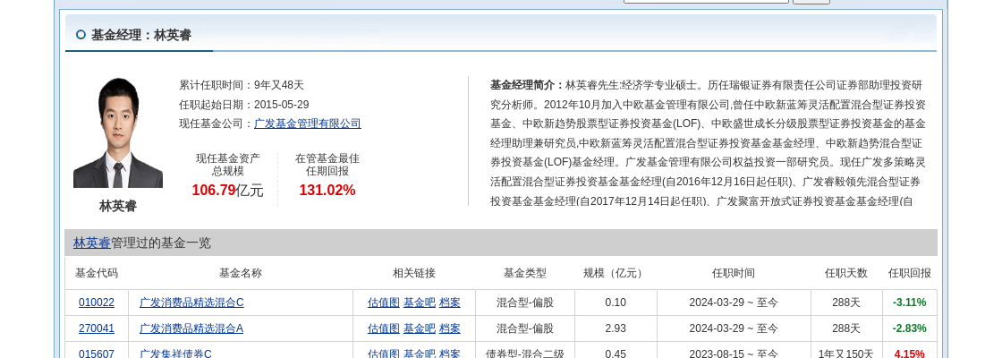 简历显示,林英睿先生:经济学专业硕士。历任瑞银证券有限责任公司证券部助理投资研究分析师。2012年10月加入中欧基金管理有限公司,曾任中欧新蓝筹灵活配置混合型证券投资基金、中欧新趋势股票型证券投资基金(LOF)、中欧盛世成长分级股票型证券投资基金的基金经理助理兼研究员,中欧新蓝筹灵活配置混合型证券投资基金基金经理、中欧新趋势混合型证券投资基金(LOF)基金经理。广发基金管理有限公司权益投资一部研究员。现任广发多策略灵活配置混合型证券投资基金基金经理(自2016年12月16日起任职)、广发睿毅领先混合型证券投资基金基金经理(自2017年12月14日起任职)、广发聚富开放式证券投资基金基金经理(自2018年11月5日起任职)、广发价值领先混合型证券投资基金基金经理(自2020年5月7日起任职)、广发鑫睿一年持有期混合型证券投资基金基金经理(自2021年11月9日起任职)。广发睿恒进取一年持有期混合型证券投资基金基金经理(自2022年2月8日起任职)。现任广发集祥债券型证券投资基金基金经理、广发消费品精选混合型证券投资基金基金经理。