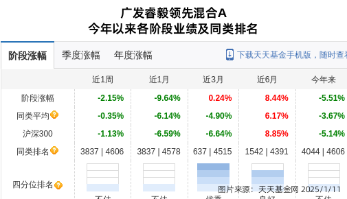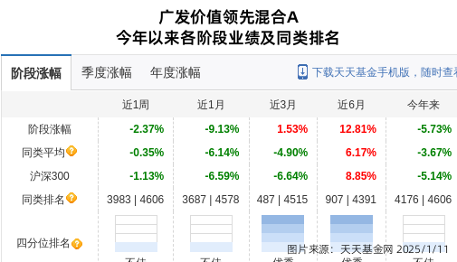 其中,广发价值领先混合A今年以来收益率-5.73%,同类排名4176(总4606),广发睿毅领先混合A今年以来收益率-5.51%,同类排名4044(总4606)。