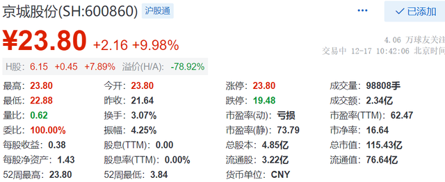 12月17日,截至10:42,京城股份(SH:600860)涨停,现报23.8元,成交额为2.34亿元,总市值为115.43亿元。