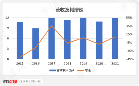 (来源:2021年年报)目前公司在国内有超过30个经销网点,主要为主流车厂提供零部件;境外有8个销售网点。天海品牌是公司在行业内知名品牌,包括北京天海、天海低温、上海天海等8个专业气体储运装备生产基地。公司的主营业务不仅涉及消防公共事业,增速10%左右;也涉及双碳政策下能源转型的天然气业务,2021年增速12.7%。公司2021年营收11.8亿,而2015年为10.7亿,也就是说,重组后7年下来CAGR仅为1.35%。