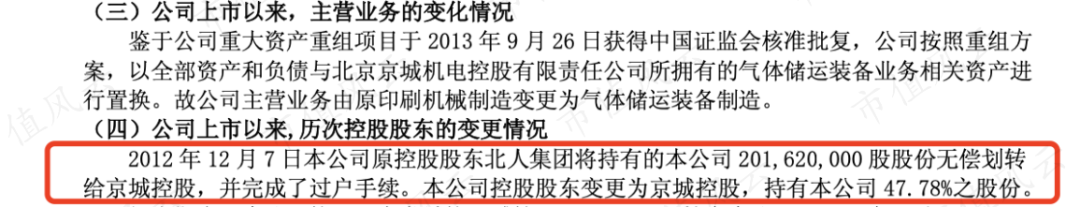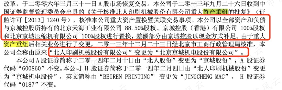 (来源:2015年年报)2013年京城股份以持有的北京天海工业有限公司88.05%的股权、京城控股(香港)有限公司和北京京城压缩机有限公司100%股权置换了北人集团的全部资产和负债。