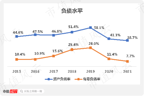 (来源:2021年年报)公司资产负债率先升后降,2021年为38.7%,有息负债率走势基本相同,2021年为7.7%。说明公司债务不高,相对安全。