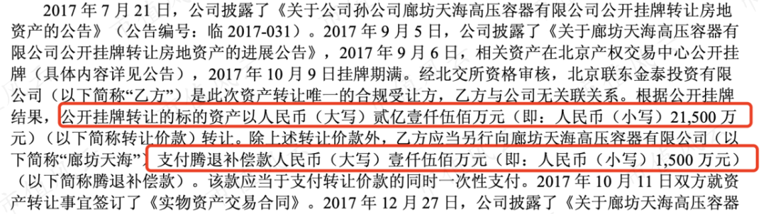 2017年,公司是通过出售作价2亿的孙公司廊坊天海物业,增加净利润约6000万,实现自救。