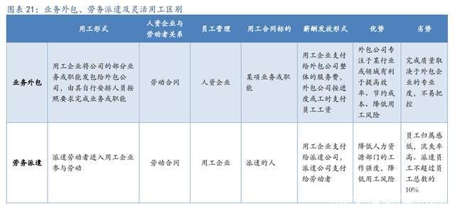 业务外包:核心内容是发包方将部分业务或工作内容交给承包方,发包方按约定向承包方支付外包费。承包方自行安排人员完成外包的业务或职能,并为工人发放工资。承包方往往专注于某些行业或领域,有利于用工企业降本提效。外包业务一般为发包方的非核心业务。