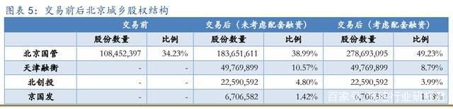 重组前,北京国管拥有北京城乡34.24%的股份,北京国管、天津融衡、北创投、京国发分别拥有北京外企86%、8.8125%、4.00%、1.1875%的股份。若重组成功,则北京国管、天津融衡、北创投、京国发、其他股东分别拥有重组后公司49.23%、8.79%、3.99%、1.18%以及36.80%的股份。(报告来源:远瞻智库)