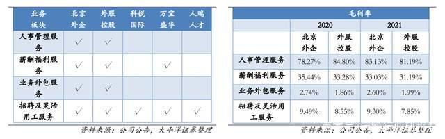 2020年北京外企的薪酬福利服务、业务外包服务以及招聘及灵活用工服务毛利率分别为35.44%/2.74%/9.49%,均高于同期外服控股相应业务毛利率,2021年这三项业务毛利率小幅下降,但仍高于同业表现。