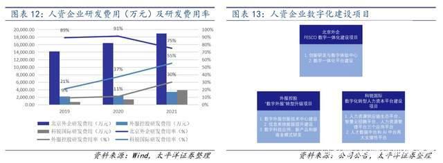 各人资企业增加的研发费用主要是用于数字化项目建设,如北京外企的 FESCO 数字一体化建设项目、外服控股的“数字外服”转型升级项目以及科锐国际的数字化人力资本平台建设项目。