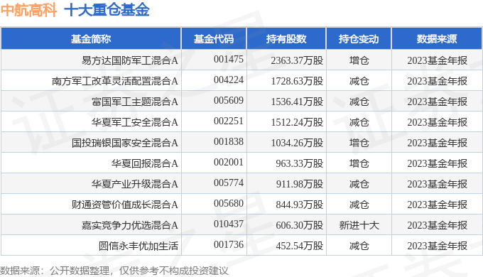 持有中航高科最多的基金为易方达国防军工混合A,目前规模为106.03亿元,最新净值1.235(3月15日),较上一交易日上涨0.57%,近一年下跌24.19%。该基金现任基金经理为何崇恺。