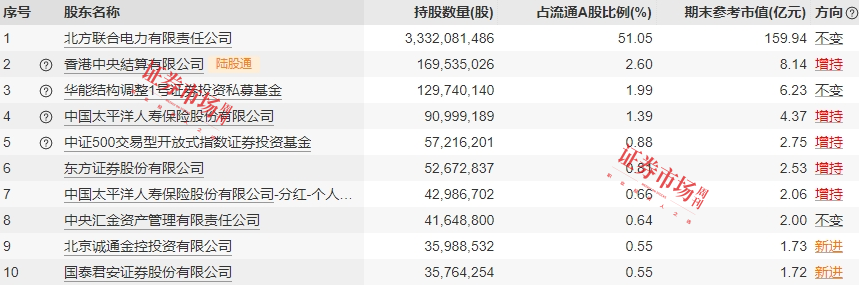 附图内蒙华电截至2024年9月末的十大流通股东情况