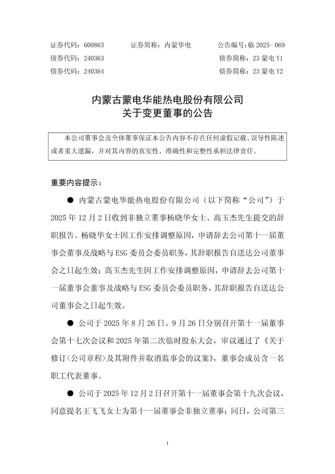 近日,内蒙古蒙电华能热电股份有限公司(简称“ 内蒙华电 ”)发布公告,对董事会多名成员进行调整。