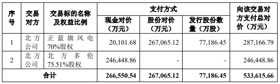 根据上市公司与北方公司签署的《发行股份及支付现金购买资产协议》及其补充协议,参考《评估报告》载明的评估结果并扣减现金分红金额,经交易双方协商,确定正蓝旗风电70%股权作价为287,166.79万元、北方多伦75.51%股权作价为246,448.86万元。交易价格合计(不含募集配套资金金额)533,615.66万元。