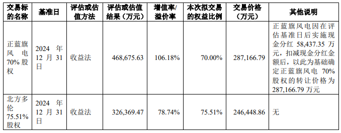 根据北京中企华资产评估有限责任公司出具并经中国华能集团有限公司备案的中企华评报字(2025)第6615号《北方联合电力有限责任公司拟转让其持有的北方多伦新能源有限责任公司股权所涉及的北方多伦新能源有限责任公司股东全部权益价值资产评估报告》、中企华评报字(2025)第6616号《北方联合电力有限责任公司拟转让其持有的北方上都正蓝旗新能源有限责任公司股权所涉及的北方上都正蓝旗新能源有限责任公司股东全部权益价值资产评估报告》,中企华以2024年12月31日为评估基准日,对正蓝旗风电、北方多伦股东全部权益价值采用收益法进行评估,正蓝旗风电股东全部权益的评估价值为468,675.63万元、北方多伦股东全部权益的评估价值为326,369.47万元。在评估基准日后,正蓝旗风电现金分红金额为58,437.35万元。