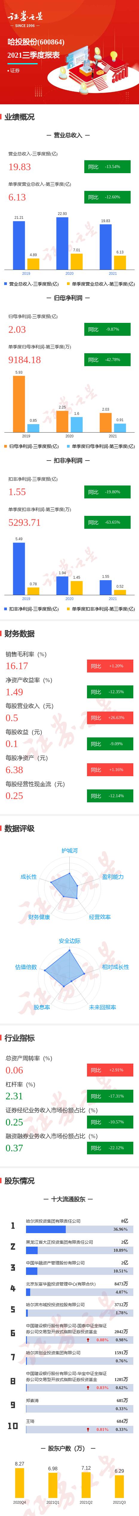哈投股份2021三季报显示,公司主营收入19.83亿元,同比下降13.54%;归母净利润2.04亿元,同比下降9.87%;扣非净利润1.56亿元,同比下降19.8%;其中2021年第三季度,公司单季度主营收入6.13亿元,同比下降12.6%;单季度归母净利润9184.18万元,同比下降42.78%;单季度扣非净利润5293.71万元,同比下降63.65%;负债率56.63%,投资收益-8222.91万元,财务费用2642.21万元,毛利率16.17%。