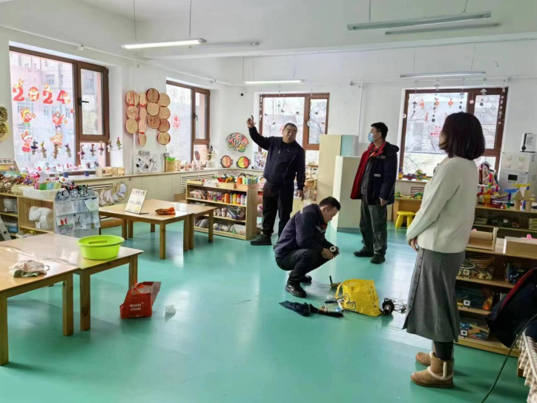 为确保辖区内在园幼儿和教职员工在园内的供热质量,切实做好供热期间“一老一小”用户服务保障工作,尹瑾珉副总经理亲自协调,综合第三运营部生产副部长曹大龙、二区域站长刘国宏、技术员杜国峰共同到现场了解情况,查找问题原因。