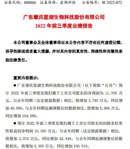 10月18日,星湖科技发布前三季度业绩预告。预计 2022 年前三季度实现归属于上市公司股东的扣除非经常性损益的净利润 10,300 万元,与去年同期(法定披露数据)相比,将增加 3,074 万元,同比增加 42.54%。与去年同期追溯调整后的数据相比,将增加 5,300 万元,同比增加 106.01%。