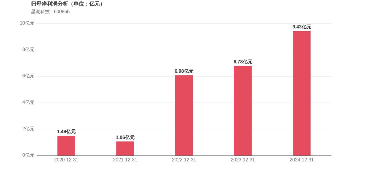 利润角度分析,2020年星湖科技实现归母净利润1.49亿元,2024年9.43亿元。公司利润在2022年同样出现显著增长,增速达到299.85%,此后两年保持稳定增长态势。