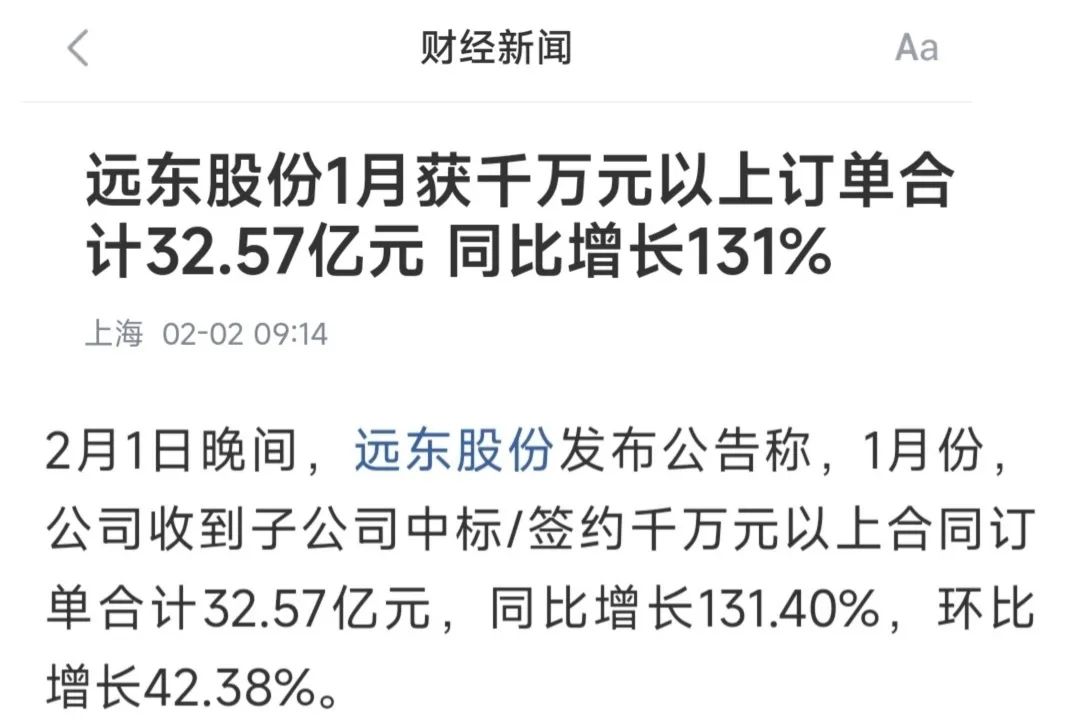 远东智慧能源股份有限公司(简称:远东股份股票代码:600869)开年传捷报,迎来开门红:1月订单超30亿元,创月度新高,受到新浪财经等多家媒体的报道和转载。