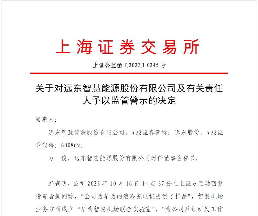 上交所表示,经查明,公司2023年10月16日14点37分在上证e互动回复投资者提问称,“公司为华为的液冷充电桩提供了样品”,智慧机场业务方面成立“华为智慧机场联合实验室”,“为公司后续研发工作提供了有力支撑”。相关回复发布后,公司股价立即从下跌约2%转为上涨约3%,收盘时上涨2.07%。经监管督促,当晚公司发布说明公告称,公司液冷大功率线缆送样的客户不是华为,是华为供应商永贵科技。目前,有关样品尚在对方测试中,是否形成收入存在不确定性。同时,公司子公司京航安与华为在“机场智能安防产品技术合作”尚处于开发阶段及尝试性研究,最终技术及相应产品能否开发成功并最终应用于市场尚存在不确定性。