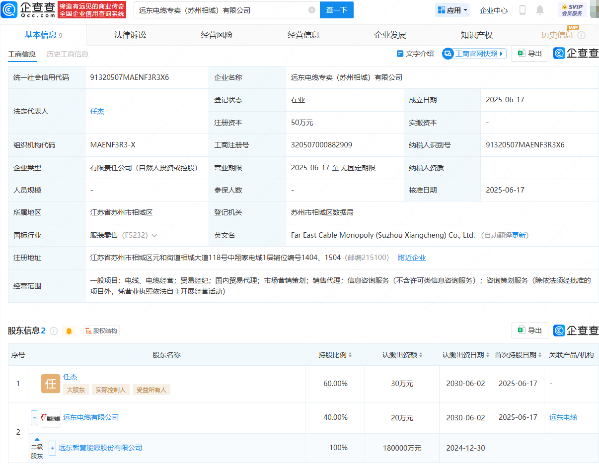 近日,远东电缆专卖(苏州相城)有限公司成立,法定代表人为任杰,注册资本为50万元,经营范围包含:电线、电缆经营;贸易经纪;国内贸易代理;市场营销策划;销售代理等。企查查股权穿透显示,该公司由任杰、远东股份(600869)旗下远东电缆有限公司共同持股。