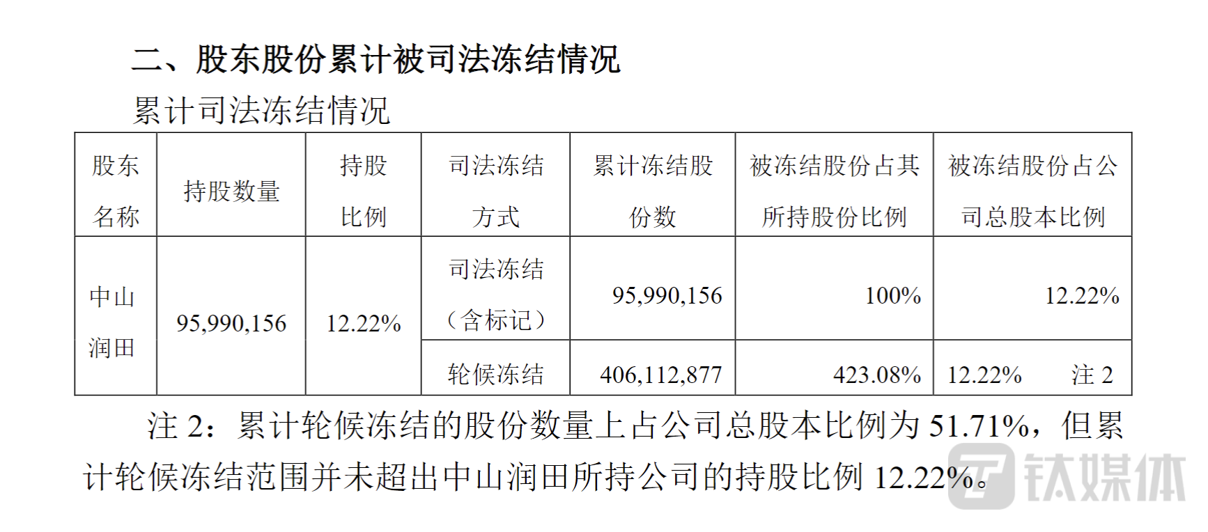 截至公告日,中山润田所持中炬高新股份(9599.02万股,占公司总股本的比例为12.22%)已全部被司法冻结,累计轮候冻结的股份数量占其所持股份比例的423.08%。