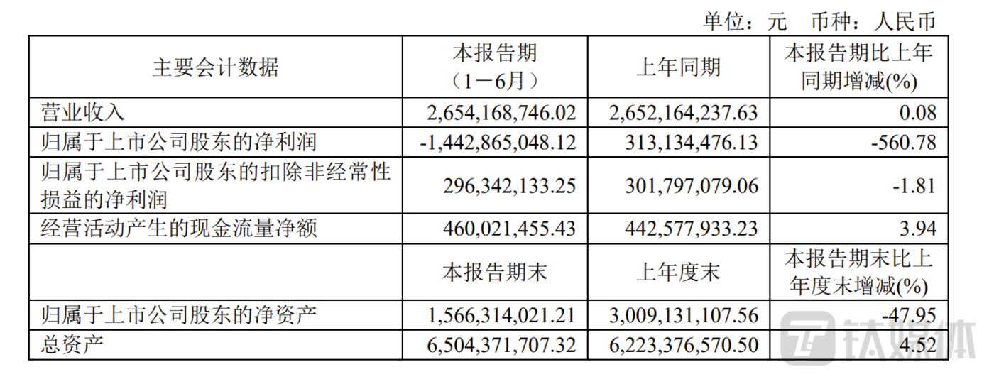 今年8月30日晚间,中炬高新发布2023年半年报,报告期内,公司实现营业收入约26.54亿元,同比微涨0.08%;实现归母净利润约-14.43亿元,同比由盈转亏;扣非净利润约2.96亿元,同比下滑1.81%。