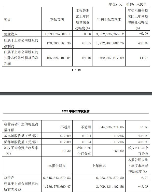2023年前三季度公司营收约39.53亿元,同比减少0.08%;归属于上市公司股东的净利润亏损约12.72亿元。