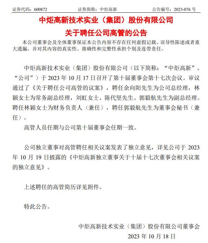 10月18日晚间,中炬高新(600872)披露了人事任命相关公告,多位“华润系”高管将走马上任成为焦点。此外,公司还披露了三季报和更换审计机构的相关公告。