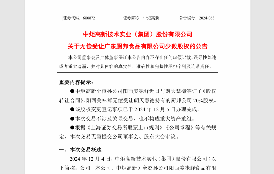 12月7日,中炬高新技术实业(集团)股份有限公司(下称“中炬高新”)发布公告称,12月4日,公司全资孙公司阳西美味鲜食品有限公司(以称“阳西美味鲜”)与北京朗天慧德企业管理有限公司(以称“朗天慧德”)签订了《股权转让合同》,朗天慧德同意将其持有的公司控股孙公司广东厨邦食品有限公司(以称“厨邦公司”)20%的股权无偿转让给阳西美味鲜,双方于12月5日办理了股权变更登记手续。