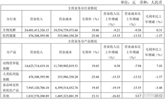 分产品来看,梅花生物2024年动物营养氨基酸收入为146.24亿元,占主营收入的58.33%,毛利率为19.65%;人类医用氨基酸收入为4.76亿元,占收入的1.9%,毛利率为25.68%。同期,该公司食品味觉性状优化产品收入为79.45亿元,同比下降19.19%,占主营收入的31.69%,毛利率为19.45%,较上年同期减少3.48个百分点。