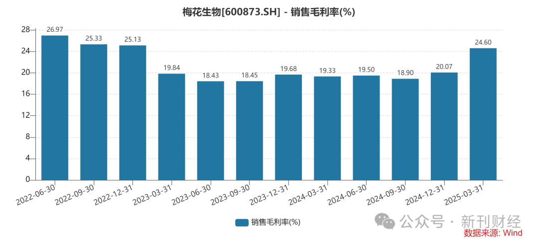 2025年一季度报的发布,为资本市场注入了一剂强心针。回顾2024年,梅花生物曾面临营收与净利润双重下滑的挑战。然而,进入2025年第一季度,尽管营收仍呈小幅下滑态势,但净利润却实现了显著增长,经营彰显韧性。从销售毛利率的变动趋势来看,2025年一季度,梅花生物的毛利率攀升至24.6%,环比上升约4.5个百分点,同比上升约5.3个百分点,几乎恢复至2022年的水平。