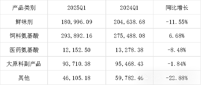 梅花生物的主营业务可细分为鲜味剂、饲料氨基酸、医药氨基酸以及大原料副产品四大核心板块。根据其2025年一季度的经营数据显示,除饲料氨基酸外,其余三大板块均呈现同比负增长态势。特别是曾作为梅花生物核心业务的鲜味剂板块,尽管销量有所上升,但受味精市场价格下滑影响,其营收同比下降了11.55%。