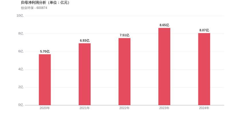 利润角度分析,2020年创业环保实现归母净利润5.70亿元,2024年8.07亿元。近五年归母净利润波动上升,但2024年出现6.7%的下滑。