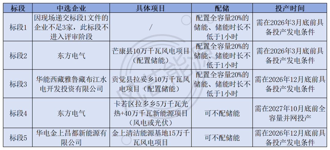 根据公示,标段1因现场递交标段1文件的企业不足3家,此标段不进入评审阶段;标段2、标段4中标企业均为东方电气;标段3中标企业为华能西藏雅鲁藏布江水电开发投资有限公司;标段5中标企业华电金上昌都新能源有限公司。