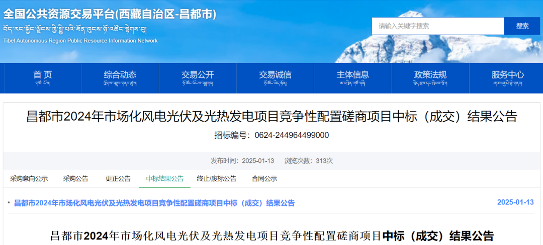 风芒能源获悉,1月13日,昌都市2024年市场化风电光伏及光热发电项目竞争性配置磋商项目中标(成交)结果公示。