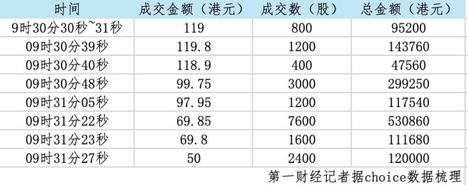 市场普遍认为,这是一起典型的"乌龙指"事件。华南某基金经理分析,这可能是交易员将19.9港元的买入价误输为119.9港元所致。除这笔交易外,当天9:30至9:32,该股还连续出现十多笔高价成交,涉及1.82万股,金额146.59万港元,从而进一步加剧了市场波动。