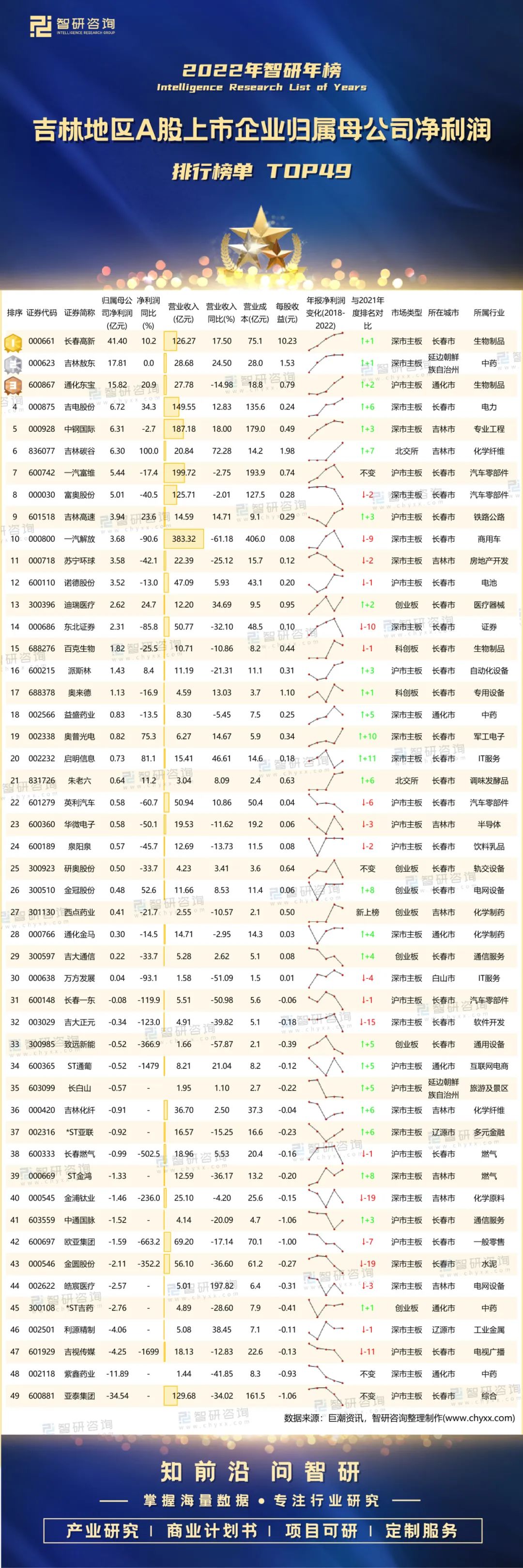 为研究吉林地区A股上市企业披露的相关利润情况,智研咨询数据中心推出《智研年榜:2022年吉林地区A股上市企业归属母公司净利润排行榜单TOP49》,以供参考。