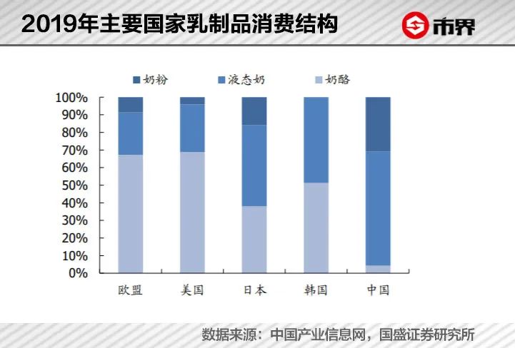 从人均消费量看,我国人均年奶酪消费量是日本的5%,不到美国的1%。在我国的乳制品消费结构中,奶酪占比不足5%。