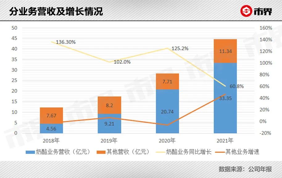 根据最新年报,2021年,妙可蓝多总营收44.8亿元,其中奶酪业务营收达33.3亿元,占总营收的比重为74%。