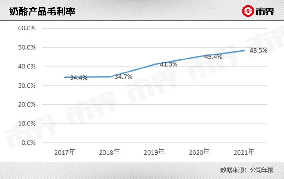2017年到2021年,妙可蓝多整个奶酪业务的毛利率也从34%提升至49%。