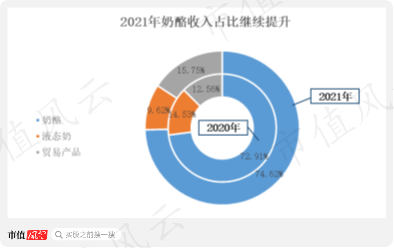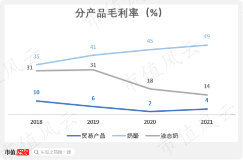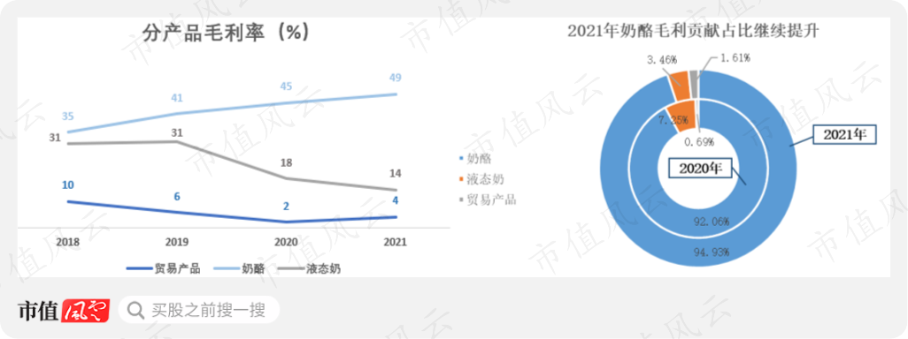 奶酪业务的毛利率也是主业中最高的,并且还在逐年提高。截止2021年已经达到49%,比38%的公司整体毛利率还高出11个百分点,毛利贡献占比也进一步提升到95%左右。