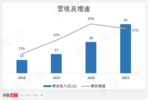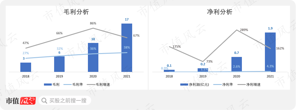 公司净利率较低,2021年获得大幅增长之后也仅有4.3%。只是从毛利及净利的增速上看成绩依然可观,前者年均增速基本在50%以上,后者则基本在150%以上。
