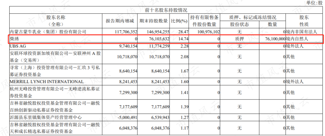 也就是说公司控股股东已经由柴琇变更为蒙牛,并且实控人也由柴琇变成了无实控人状态。