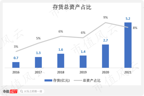 放到妙可蓝多身上几乎完美适用,其存货指标也开始出现了一些令人担忧的信号。2021年存货规模较去年同期大幅增长94%,而存货占总资产比例则是从2020年起就明显提升了3-4个百分点。