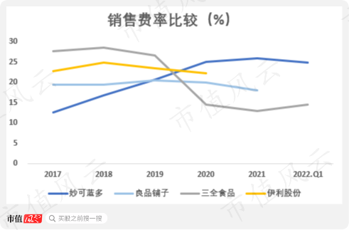 并且对比起其他快销品牌,妙可蓝多的营销费率也并没有高到离谱的程度,甚至在2017-2019年还显著低于这三家可比公司。