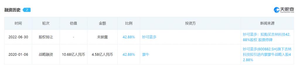 至于本次的收购标的吉林科技,此次交易的 42.88%股权在两年前由内蒙古蒙牛乳业(集团)股份有限公司(简称"内蒙蒙牛")增资获得。