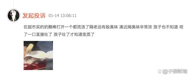 1月14日,还有一位网友投诉称自己在超市买的奶酪棒打开后出现臭味,而且孩子还咬了一口。