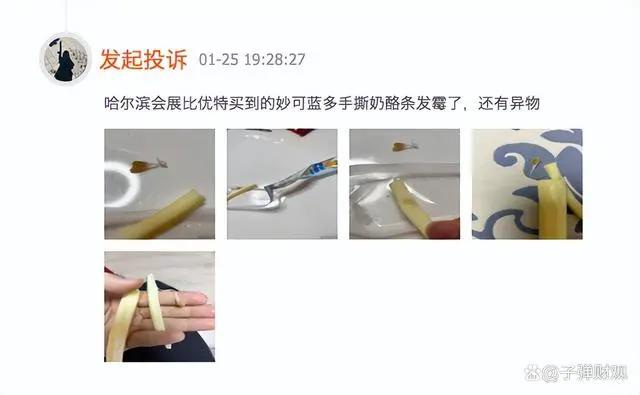 1月25日,有网友投诉称“奶酪条有异物发霉”,并索要1000元的赔偿,该网友称在哈尔滨会展比优特买到了妙可蓝多手撕奶酪条发霉了,还有异物。