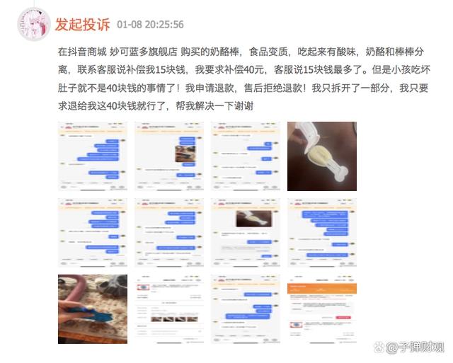 1月8日,有网友称自己在妙可蓝多的旗舰店上购买的奶酪棒,出现食品变质,吃起来有酸味,奶酪与木棒分离的情况。客服表示可以补偿该网友15元,但网友要求40元的补偿。而且网友申请退款但被售后拒绝,因此网友发起投诉。